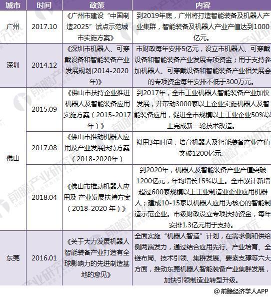 截至2018年,有14個地級市出臺機器人產業發展和加大科研投入建立智能型機器人研發機構的相關政策和獎勵機制,包括廣州、佛山、東莞、嘉興、泉州、長沙等。