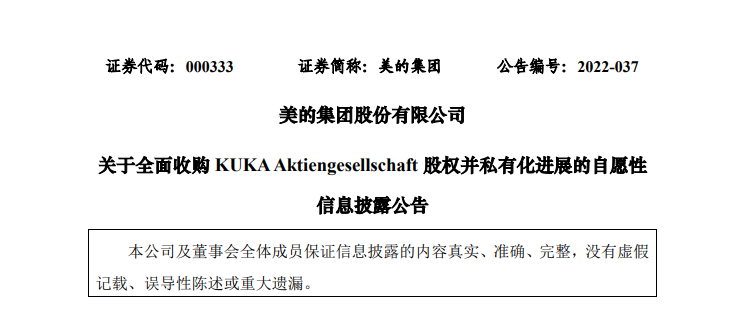 2021年11月,美的集團(tuán)發(fā)布公告稱,擬全面收購庫卡股權(quán),收購?fù)瓿珊螅瑤炜▽⒊蔀槊赖娜Y控股的境外子公司,并從法蘭克福交易所退市。