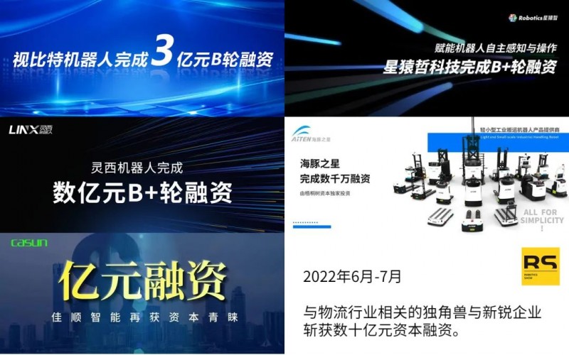 敏銳的資本最先觀(guān)察到這波新的移動(dòng)機(jī)器人(AGV/AMR)與物流相關(guān)機(jī)器人爆發(fā)苗頭。據(jù)不完全統(tǒng)計(jì),就2022年6月與7月間,與物流行業(yè)相關(guān)的獨(dú)角獸與新銳企業(yè)斬獲數(shù)十億元資本融資:視比特(展位號(hào):8.1H C198)完成3億元B輪融資,星猿哲科技(展位號(hào):7.1H E230)完成融資金額約4000萬(wàn)美元的B+輪融資,靈西機(jī)器人(展位號(hào):8.1H C062)完成數(shù)億元B+輪融資,佳順智能(展位號(hào):7.1H D125)再獲近億元人民幣的融資,海豚之星(展位號(hào):7.1H E175)宣布完成數(shù)千萬(wàn)元融資......均是千萬(wàn)級(jí)以上投資。