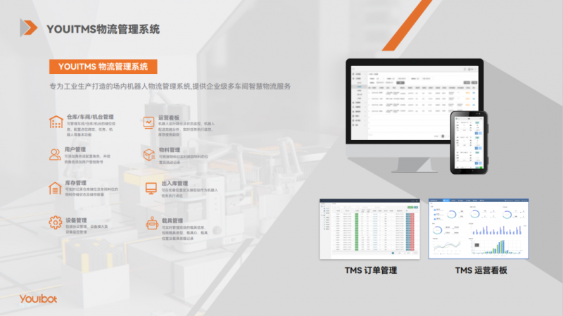 在移動機(jī)器人基礎(chǔ)上,優(yōu)艾智合智慧物流管理系統(tǒng)YOUI TMS與企業(yè)MES、WMS等信息化系統(tǒng)對接,100%追蹤回溯每一件物料信息,完成物料從備料倉到產(chǎn)線再到成品倉的完整閉環(huán),在提質(zhì)增效的基礎(chǔ)上幫助企業(yè)實(shí)行柔性生產(chǎn)與數(shù)字化管理。