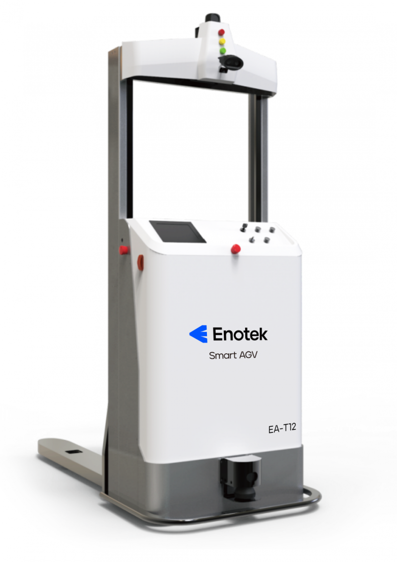 產品采用激光導航技術,具有最小通道通行能力和最小轉彎半徑,自重700kg,額定荷載達1200kg,驅動方式為單舵輪驅動,可前進、后退、弧線轉彎,并通過了TUV的CE認證。