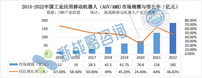2022年度,中國工業應用移動機器人(AGV/AMR)銷售數量93000臺(含銷往海外市場),較2021年增長29.17%,市場規模達到185億元,同比增長46.82%。