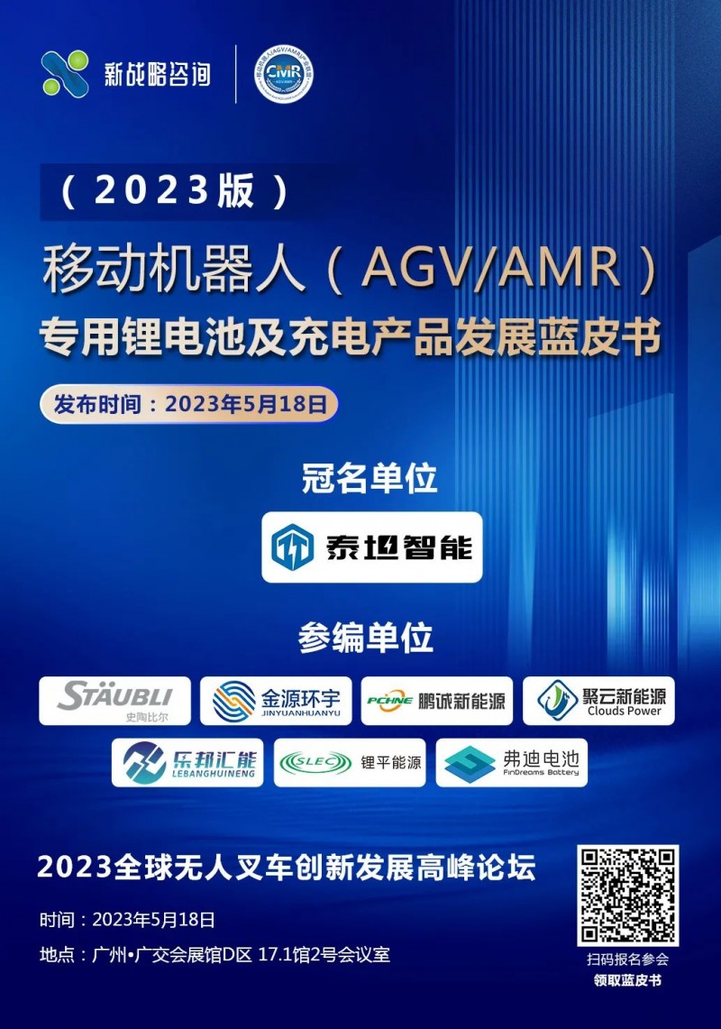 為了更好地解讀當(dāng)前AGV/AMR市場鋰電池及充電產(chǎn)品相關(guān)應(yīng)用情況及趨勢,5月18日,由CMR產(chǎn)業(yè)聯(lián)盟及新戰(zhàn)略移動機(jī)器人產(chǎn)業(yè)研究所主編,廣東泰坦智能動力有限公司冠名發(fā)布,史陶比爾(杭州)精密機(jī)械電子有限公司、河南金源環(huán)宇儲能技術(shù)有限公司、深圳市鵬誠新能源科技有限公司、蘇州聚云新能源科技有限公司、樂邦新能源(天津)有限公司、上海鋰平能源科技有限公司、深圳比亞迪鋰電池有限公司/弗迪電池等企業(yè)聯(lián)合參編的《移動機(jī)器人(AGV/AMR)專用鋰電池及充電產(chǎn)品發(fā)展藍(lán)皮書(2023版)》將在“2023全球無人又車創(chuàng)新發(fā)展高峰論壇”上正式發(fā)布!敬請期待!