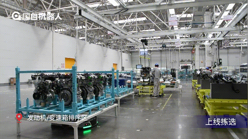 高位貨架區,質檢合格的零部件由叉式堆垛AGV執行入庫上架任務,搬運至高位貨架區進行存儲,出庫任務由叉式堆垛AGV和潛伏頂升式AGV協同完成。在發動機/變速箱排序,由潛伏頂升式AGV實現發動機和變速箱料架上線揀選、余料回庫、空托搬運,該解決方案上線后,有效提升倉儲物流效率和汽車生產效率。