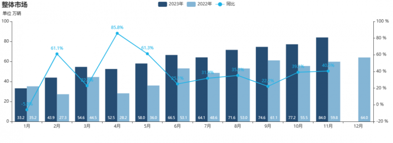 據中國汽車工業協會統計,1-11月,汽車產銷累計完成2711.1萬輛和2693.8萬輛,同比分別增長10%和10.8%,增速較1-10月分別提升2和1.7個百分點。至此,2023年前11個月,汽車產銷量已超過2022年全年(2022年我國汽車產銷分別為2702.1萬輛和2686.4萬輛)。預測2023年中國汽車銷量或接近3000萬輛,同比增長可能超過10%,超過2017年的2888萬輛創歷史新高。