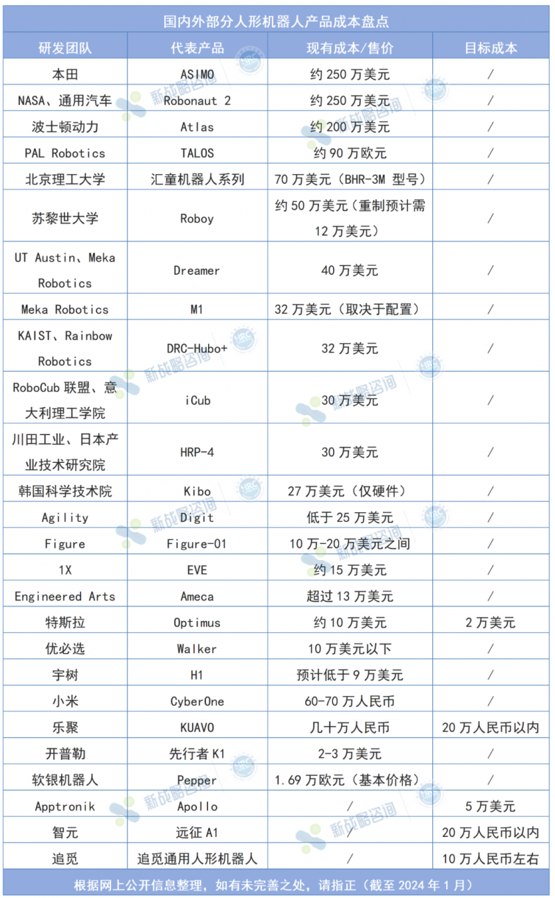 20余款人形機器人成本大公開!