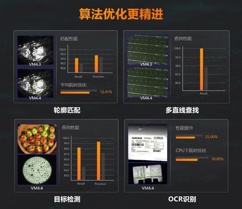 VM4.4對模板匹配、Blob、目標檢測、OCR、圖像處理、讀碼等多個算法工具進行了效率提升和性能優(yōu)化,基于海量工業(yè)場景數(shù)據(jù),推出了通用識別模型,無需二次訓練,能直接滿足大多數(shù)工業(yè)場景的檢測需求。