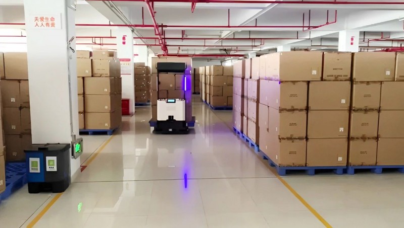 某華南成衣制造企業,其倉庫為典型的地堆式,擁有超過4000個庫位,且庫位間距小、物料變動大,無法使用2D激光導航,最終采用邁爾微視頂視SLAM導航解決方案,將導航模塊安裝于AGV叉車頂部,負責運輸托盤。