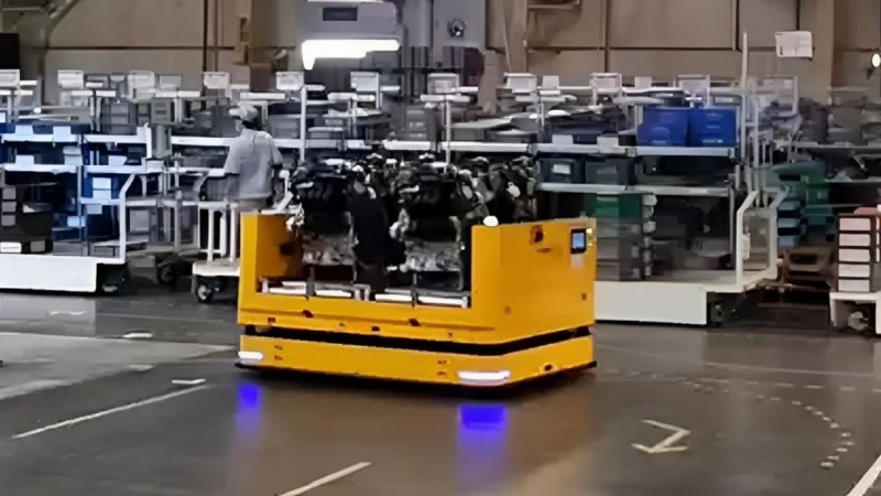 某華南汽車制造企業,車間環境空曠,周邊擺滿周轉料車,且人車混流,廠房內零部件堆放變化大,屬于典型的高動態環境,傳統2D激光雷達定位十分困難。為滿足該場景需求,采用邁爾微視SLAM導航定位方案,將傳感器安裝于大型輥筒搬運AMR上端,負責運輸發動機部件,提高機器人定位的穩定性。