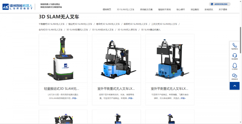 官網(wǎng)精心設計了3D SLAM無人叉車系列產(chǎn)品矩陣展示區(qū),從輕量搬運式到前移式,再到室外平衡重式無人叉車,全方位覆蓋不同行業(yè)、不同場景的需求。