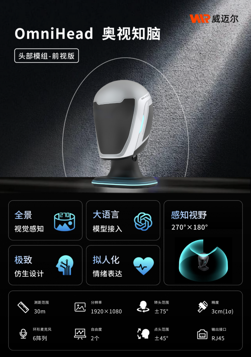 作為藍芯科技全資子公司,威邁爾科技依托在移動機器人領域多年的技術沉淀,將工業級感知能力下沉至人形機器人賽道,推出頭部模組OmniHead。該模組以多模態融合感知為核心、開放系統為支撐,不僅補齊當前人形機器人在感知維度完整性與認知決策深度上的關鍵短板,更構建了可擴展、高兼容的感知基座,為具身智能規模化落地奠定基礎。