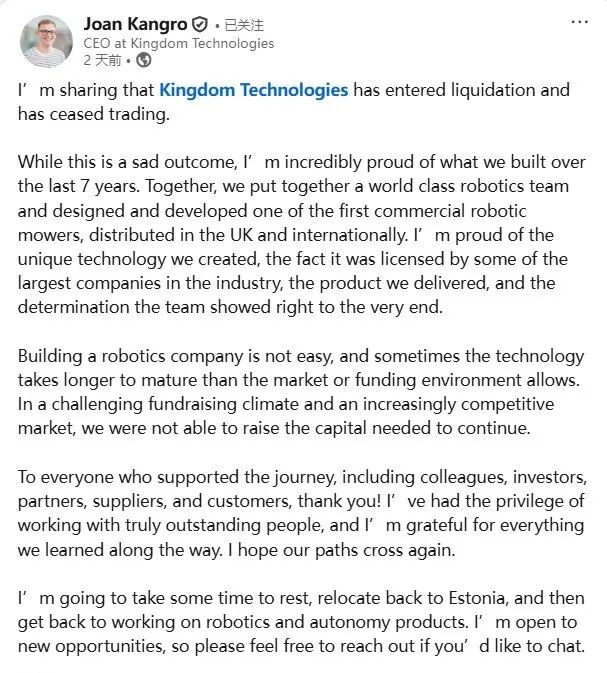 核心提示:1月23日,英國商用割草機器人廠商 Kingdom Technologies 宣布進入清算程序。其CEO發(fā)文表示,非常自豪曾組建起世界一流的機器人團