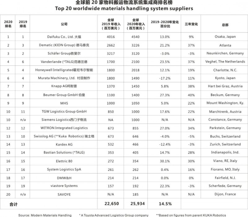 美國物料搬運權威雜志,MMH近期公布了全球20大物流系統集成商的最新排名。今年的排名顯示,在電子商務激增的推動下,在艱難的一年里,電商履行中心的自動化程度也相應提高。