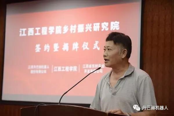 江西丹巴赫機器人股份有限公司總經理發言,他表示,丹巴赫機器人擁有很強的研發能力和創新氛圍,是國家高新技術企業,國家科技重大專項03專項研發承擔單位,第二十二屆中國國際高新技術交易會上,5G移動機器人獲得優秀產品創新獎,特別是在移動機器人(AMR)、AGV叉車、農業機器人、環衛機器人等技術領域持續發展。他提到,江西工程學院作為智慧農業的研究基地,丹巴赫機器人作為智慧農業領域深耕的企業,雙方的深入合作,將極大帶動產業發展,加速鄉村振興研究院的升級革新。