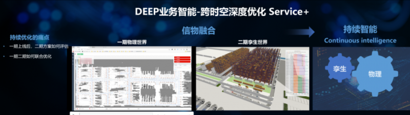 在持續優化方面,Service+通過讓一期物理世界和二期孿生世界,實現信物融合,從而獲得持續智能,解決了二期方案評估,以及一期二期聯合優化的問題。