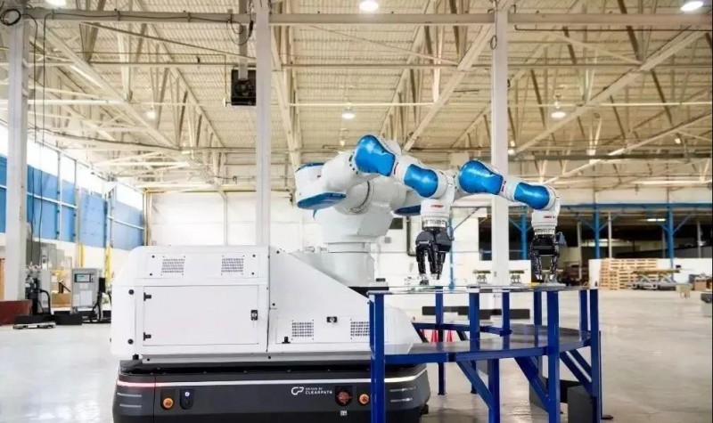 而發那科則選擇與安吉智能攜手, 2018年,雙方聯合推出了具有區域移動能力的協作機器人,將各自在智能AGV技術與協作機器人領域的優勢相結合,突破常規機器人只能在導軌上作直線運動的限制、區域移動小車在行駛過程中存在的安全隱患、移動后再定位精度低的問題。同時,借助機械臂內置的工業相機,以及AGV小車中的電池及逆變電流器,讓AGV小車可以自由載著機械臂到達指定工位,進行產品的精密的定位和抓取,極大地拓展了機械臂與AGV小車的適用范圍。