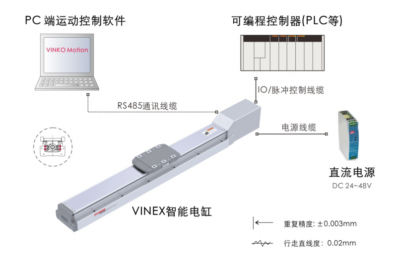 Vinex S系列為點位脈沖型電缸。可兼容PIO定位模式,脈沖模式和485通訊模式。Vinex Q系列為總線型電缸,可通過EtherCAT總線,實現與PLC的通訊控制,實現多軸聯機和總線控制。
