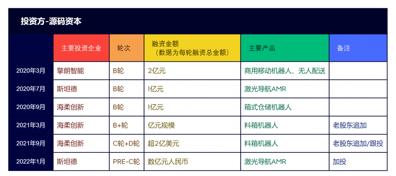 2020年至2021年,在移動(dòng)機(jī)器人行業(yè),源碼資本參與了7起融資案件,每輪融資總金額均為億元級規(guī)模。