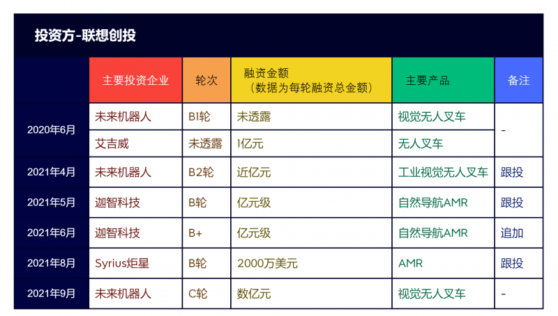 2020年至2021年,聯(lián)想創(chuàng)投在移動(dòng)機(jī)器人行業(yè)參與了7起融資事件,被投企業(yè)包括未來機(jī)器人、艾吉威、迦智科技、Syrius炬星。