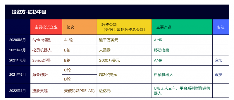 2020年以來,紅杉中國在工業(yè)應(yīng)用移動(dòng)機(jī)器人行業(yè)中共參與了6起融資事件,被投企業(yè)主要產(chǎn)品覆蓋了移動(dòng)機(jī)器人的移動(dòng)底盤、無人叉車以及AMR等,企業(yè)專注市場領(lǐng)域從海內(nèi)囊括到海外,包括上文提及的“海歸”Syrius炬星、專注于“箱式倉儲機(jī)器人”的海柔創(chuàng)新,以及“移動(dòng)底盤專家”松靈機(jī)器人和“打破傳統(tǒng)叉車固化設(shè)計(jì)”捷象靈越。