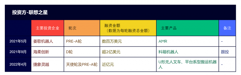 近兩年,聯(lián)想之星在工業(yè)移動(dòng)機(jī)器人領(lǐng)域投資了三家企業(yè),包括箱式倉儲機(jī)器人科技企業(yè)海柔創(chuàng)新、機(jī)器人通用底盤松靈機(jī)器人、AMR機(jī)器人公司姜歌機(jī)器人,基本上都是從天使輪開始切入。