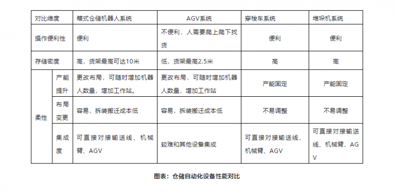 在3PL及電商倉儲(chǔ)中,當(dāng)前主要有4類自動(dòng)化解決方案,箱式倉儲(chǔ)機(jī)器人/AGV系統(tǒng)/穿梭車系統(tǒng)/堆垛機(jī)系統(tǒng),四類方案各有其優(yōu)劣勢。